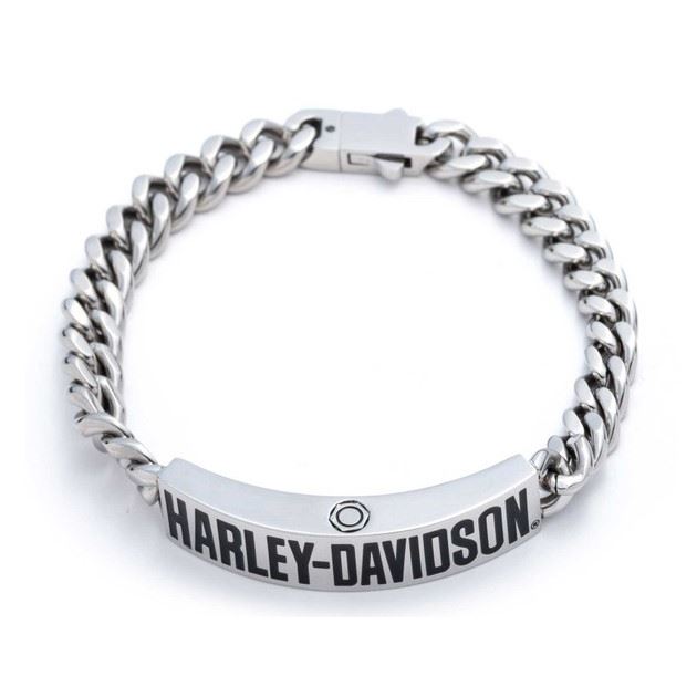 Popis Masivní curb‑chain náramek s výraznou Harley‑Davidson® destičkou v kontrastním černém emailu. Vyroben z nerezové oceli, odolný proti korozi a stálý i při každodenním nošení — stylový doplněk, který vydrží jízdu za jízdou.