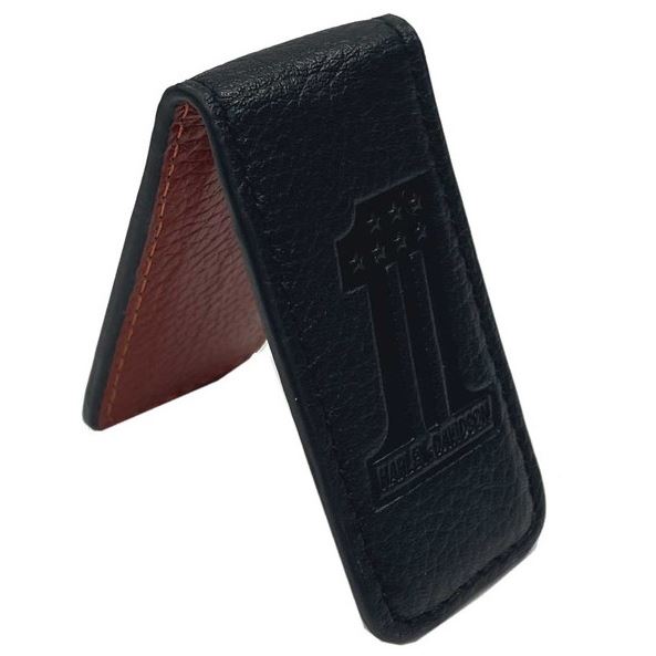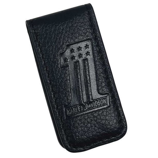 Elegantní a kompaktní money clip Harley‑Davidson® v černém provedení. Vyrobena z kvalitní pevné kůže s výrazným raženým motivem „#1“. Silný magnetický uzávěr bezpečně drží bankovky pohromadě, přitom zůstává tenká a praktická do kapsy.