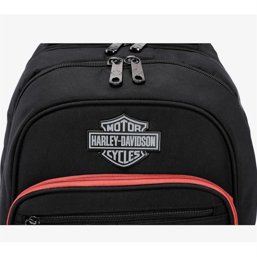 Uvnitř najdeš velký hlavní prostor s vnitřními kapsami a samostatnou, polstrovanou přihrádkou na notebook, takže máš elektroniku i věci na cesty bezpečně uložené. Přední kapsy na zip umožní rychlý přístup k drobnostem, dokladům nebo cestovní výbavě. Polstrované ramenní popruhy a vrchní madlo se postarají o pohodlí i při celodenním nošení. Velké kovové Bar & Shield logo doplní tahle funkční výbava o jasný H-D podpis.