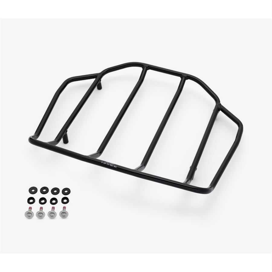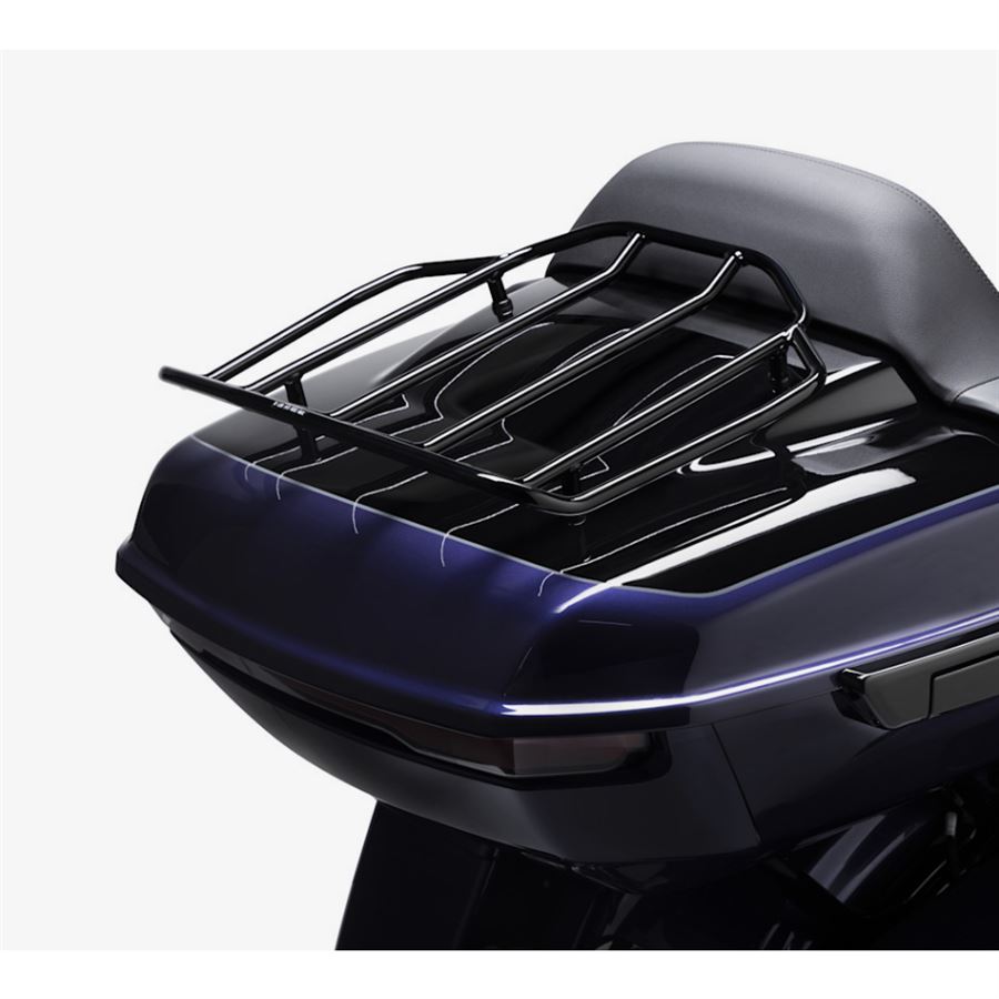 Lehká ocelová konstrukce s kvalitními svařovanými spoji nabízí dostatek plochy pro přichycení další bagáže – spacák, role, duffelka – aniž bys riskoval poškrábání laku Tour-Paku nebo opěrky. Lesklý černý povrch elegantně navazuje na moderní vzhled nových Touringů a CVO modelů.