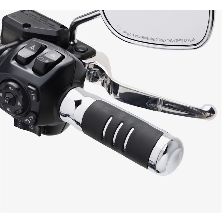 Streamliner Hand Grips přinášejí nadčasový harleyovský styl v moderním, elegantním podání. Inspirace zaoblenými tvary a dlouhými vodorovnými liniemi architektury Streamline Moderne se tu potkává s kombinací hluboké černé gumy a výrazného chromu – výsledek je čistý, aerodynamický vzhled, který perfektně sedí k novým Softail, Touring i CVO modelům.