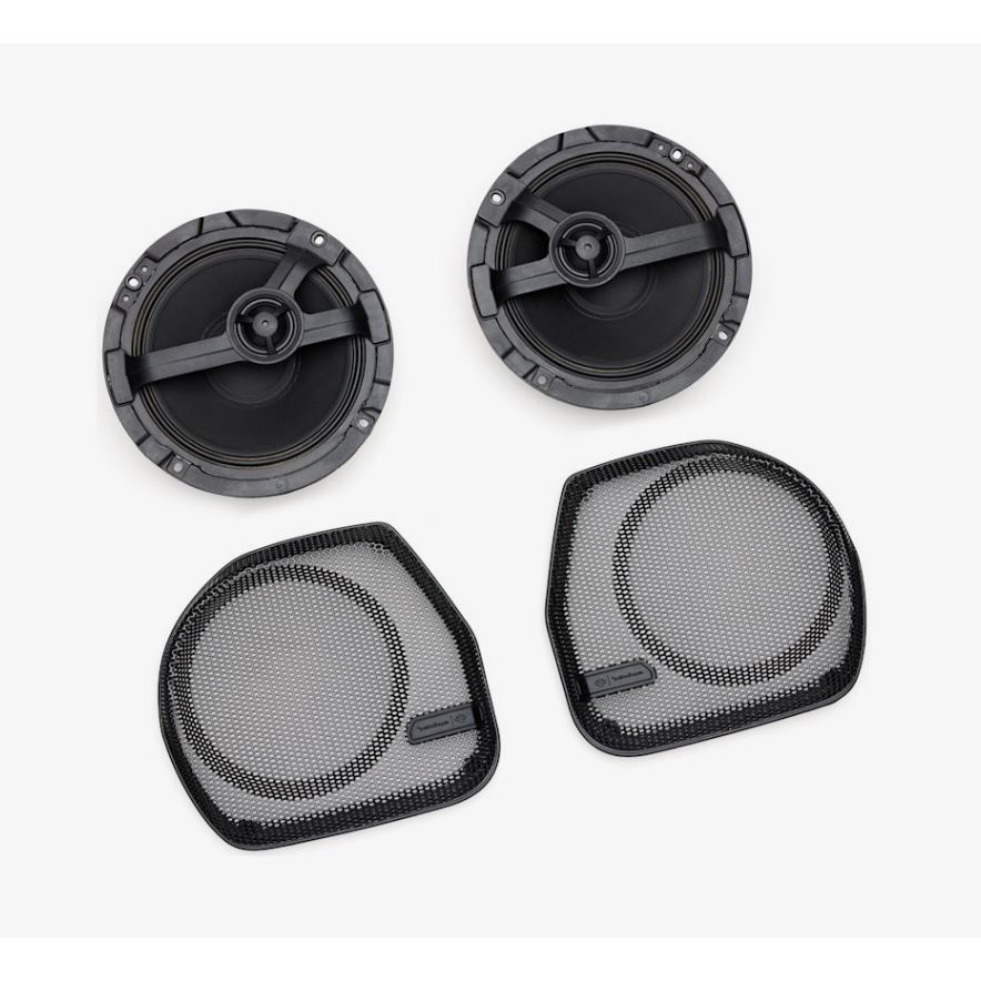 Dvou pásmové 6,5" reproduktory s injekčně lisovaným wooferem a samostatným tweeterem jsou stavěné přímo pro prostředí motorky – voda, prach, UV, vibrace. Vejdou se do originálních spodních kapotáží, včetně vlastních mřížek s černým emblémem. V kombinaci s H-D zesilovači dostaneš ucelený systém, který se po montáži jednoduše doladí přes Skyline™ OS na displeji – žádné složité nastavování navíc.