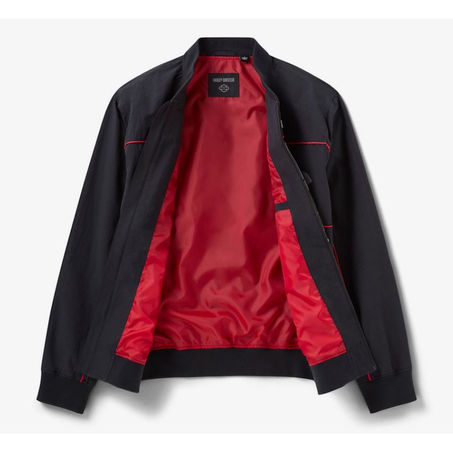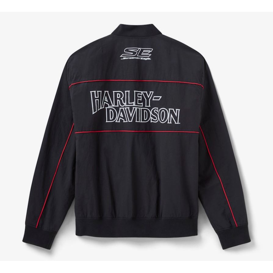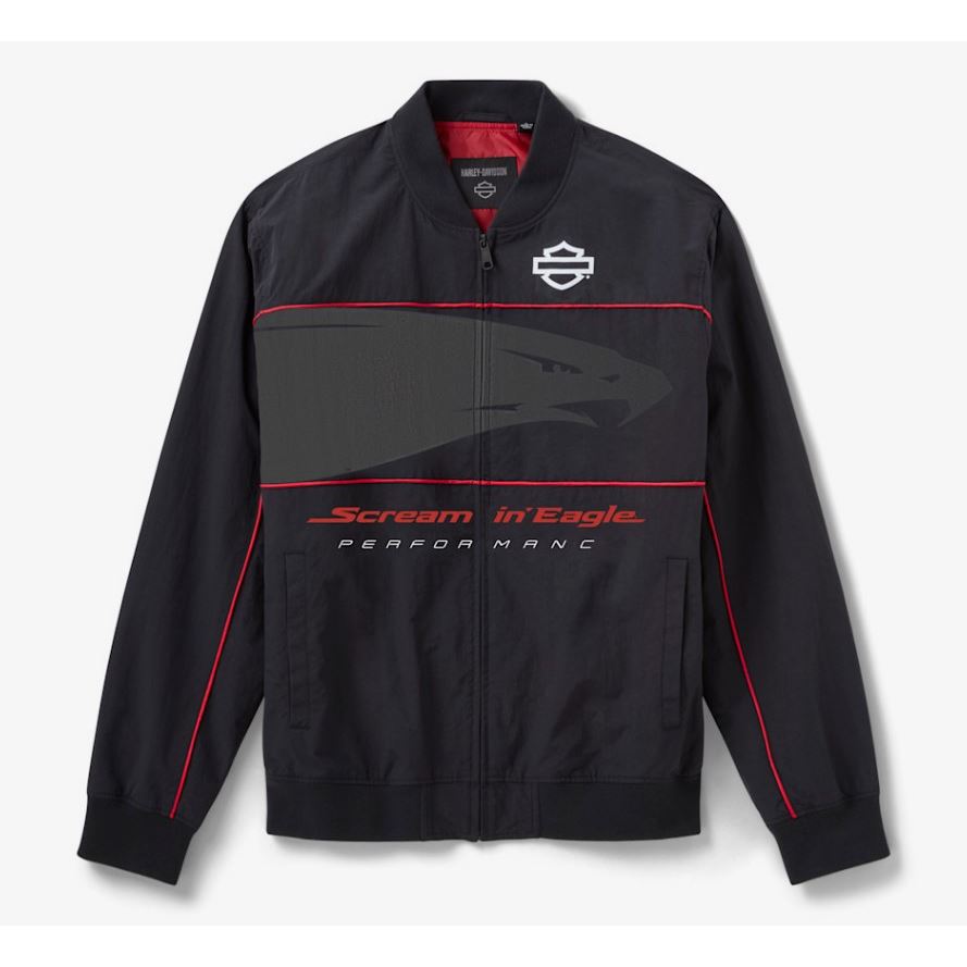 Pánská svrchní bunda je doplněna červeným lemem a podšívkou pro výrazný kontrast a rib-knit detaily pro zvýšenou odolnost a pružnost. Její aerodynamický vzhled je završeno montáží grafik Screamin' Eagle na přední a zadní straně.