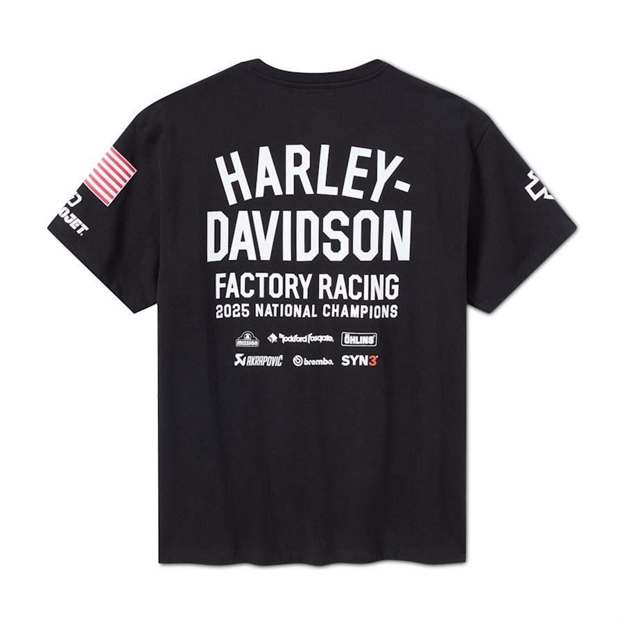 Popis H‑D Championship Tee vzdává hold závodní historii Harley‑Davidson® — stylové černé tričko s bohatou grafikou, která kombinuje sponzory, produkty a vítězné tituly továrního závodního týmu. Relaxed střih a midweight 100% bavlněný jersey zajišťují pohodlí a prodyšnost na každý den.