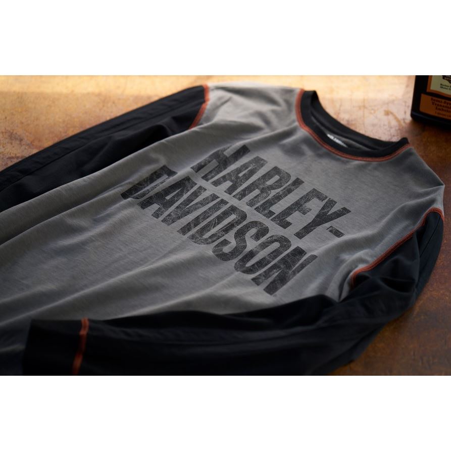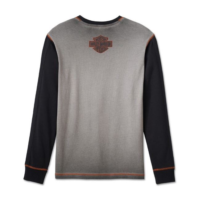 Subtilní pruhování na rukávech, kontrastní coverstitch švy a žebrovaný kontrastní lem u krku dávají triku mix retro a moderního vzhledu. Soft-hand potisk a tkaný brandový štítek dodávají autentický H-D charakter, ale bez přehnaně křiklavé grafiky.