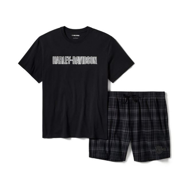 Pánský pyžamový set Plaid Pajama Shorts Set je přesně to, v čem se dobře usíná s hlavou plnou dalších cest a plánů na vyjížďky. Horní díl z měkkého bavlněno‑modalového jersey je příjemný na těle a díky žebrovanému lemování kolem krku drží tvar i po opakovaném praní. Na hrudi ho zdobí výrazný Harley-Davidson nápis v měkkém (soft-hand) potisku.