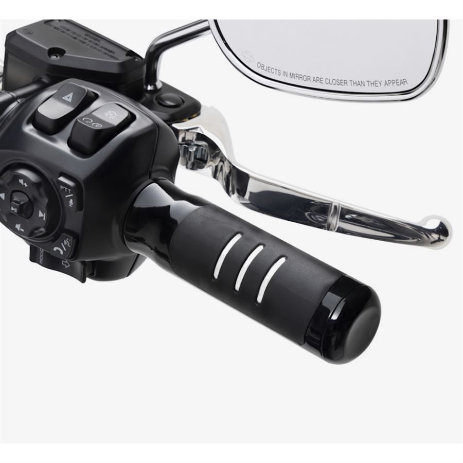 Streamliner Hand Grips navazují na klasický harleyovský styl, ale dávají mu moderní, temnější tvář. Inspirace zakulacenými tvary a dlouhými horizontálními liniemi stylu Streamline Moderne se tu potkává s leskle černým povrchem a chromovanými proužky – výsledkem je elegantní, aerodynamický vzhled, který skvěle sedí k novým Softail, Touring i CVO modelům.