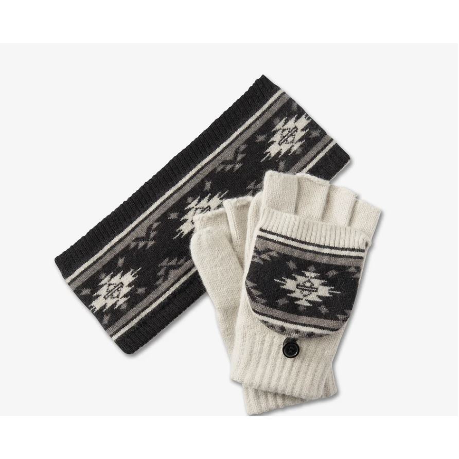 Set obsahuje pletené rukavice s překlopným krytem na prsty a oboustrannou čelenku, oboje z příjemné směsi akrylu, nylonu a polyesteru.