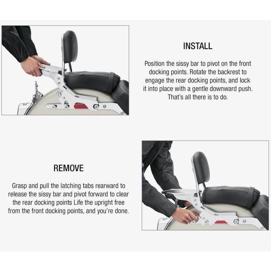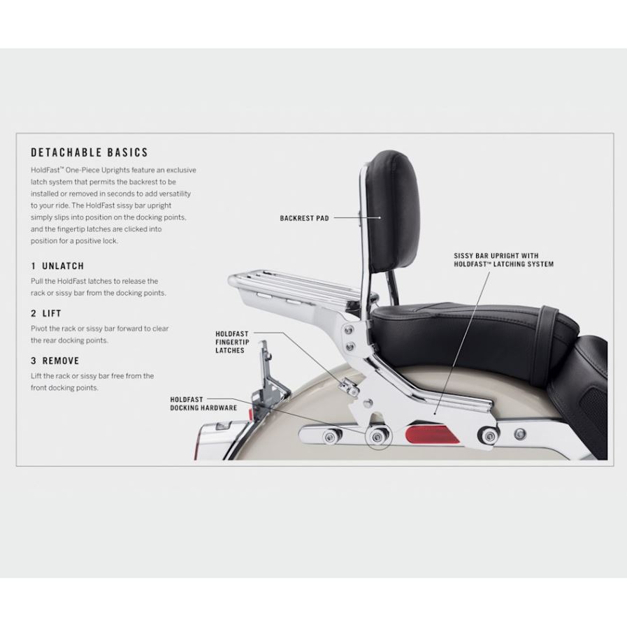Díky systému HoldFast™ lze sissy bar kdykoli během pár vteřin nasadit nebo sundat – stačí jej zasunout do docking hardwaru a zacvaknout prstové pojistky. Když jedeš sólo a chceš čistý zadek motorky, sissy bar jednoduše odcvakneš a uložíš. Když vyrážíte ve dvou, během chvilky je zpátky na svém místě.