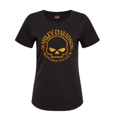 Dámské tričko Harley-Davidson Willie G Skull v černé barvě zaujme svým legendárním lebkovým motivem v odstínu zlaté.