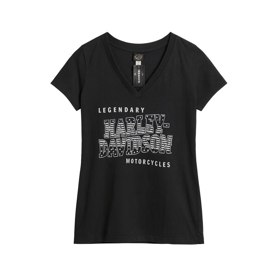Toto černé dámské tričko z 100% bavlny spojuje jednoduchý střih s výraznou grafikou Legendary Harley-Davidson Motorcycles na hrudi.