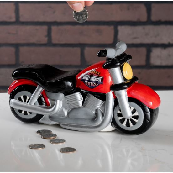 Stylová dětská pokladnička ve tvaru motocyklu Harley-Davidson® je skvělý způsob, jak motivovat malé fanoušky k šetření a zároveň ozdobit dětský pokoj.