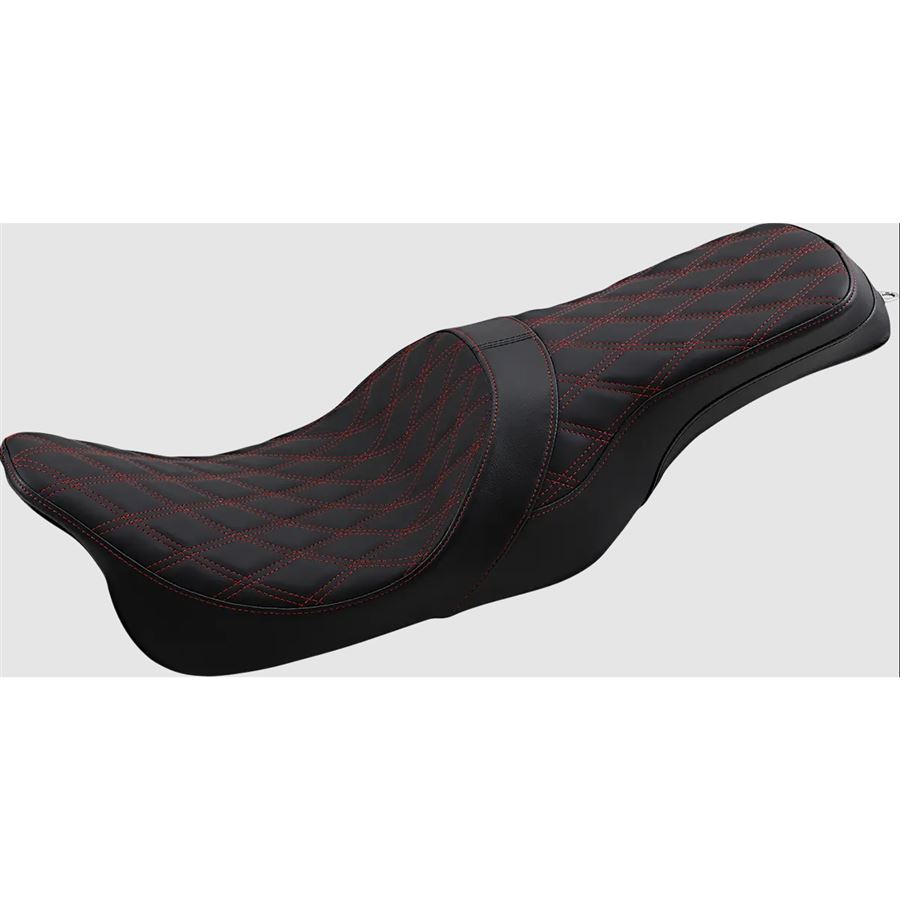 Vrchní část je z patentované solar‑reflective kůže, která umí snížit povrchovou teplotu až o cca 25 °F oproti běžné kůži nebo vinylu, takže se v létě méně rozpaluje a vydrží déle. Boky jsou z automobilového vinylu pro vyšší odolnost. Tvar sedla s dvojitým diamantovým prošitím v červené (double diamond red stitching) dodává motorce výrazný custom look, aniž by utrpěl komfort – polyuretanová pěna je tvarovaná pro maximální pohodlí jezdce i spolujezdce.