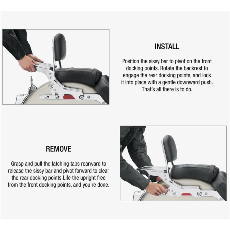 Díky systému Harley-Davidson HoldFast™ One-Piece Upright můžete sissy bar nainstalovat nebo sejmout během několika sekund, bez nutnosti použití nářadí. Patentovaný zajišťovací mechanismus s rychloupínacími západkami zaručuje pevné a bezpečné uchycení při každé jízdě.