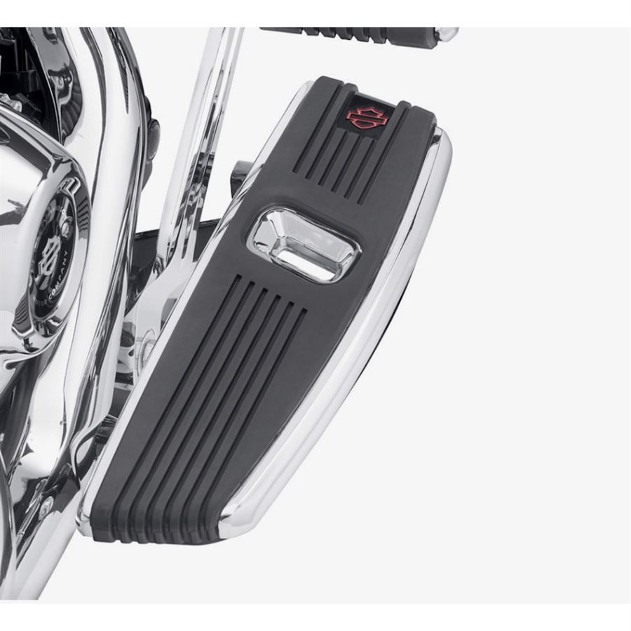 Na vnějším okraji plošin nechybí červené Bar & Shield logo jako jemný, ale jasný podpis Harley-Davidson. Plošiny jsou navrženy jako přímá náhrada za originální rider footboardy a perfektně ladí s ostatními doplňky z Kahuna Collection (gripy, stupačky, pedály atd.), takže snadno sjednotíš vzhled celé motorky. Vložky jsou uloženy přes silentbloky (vibration-isolated inserts), což pomáhá tlumit vibrace a zvyšuje komfort na delších trasách.