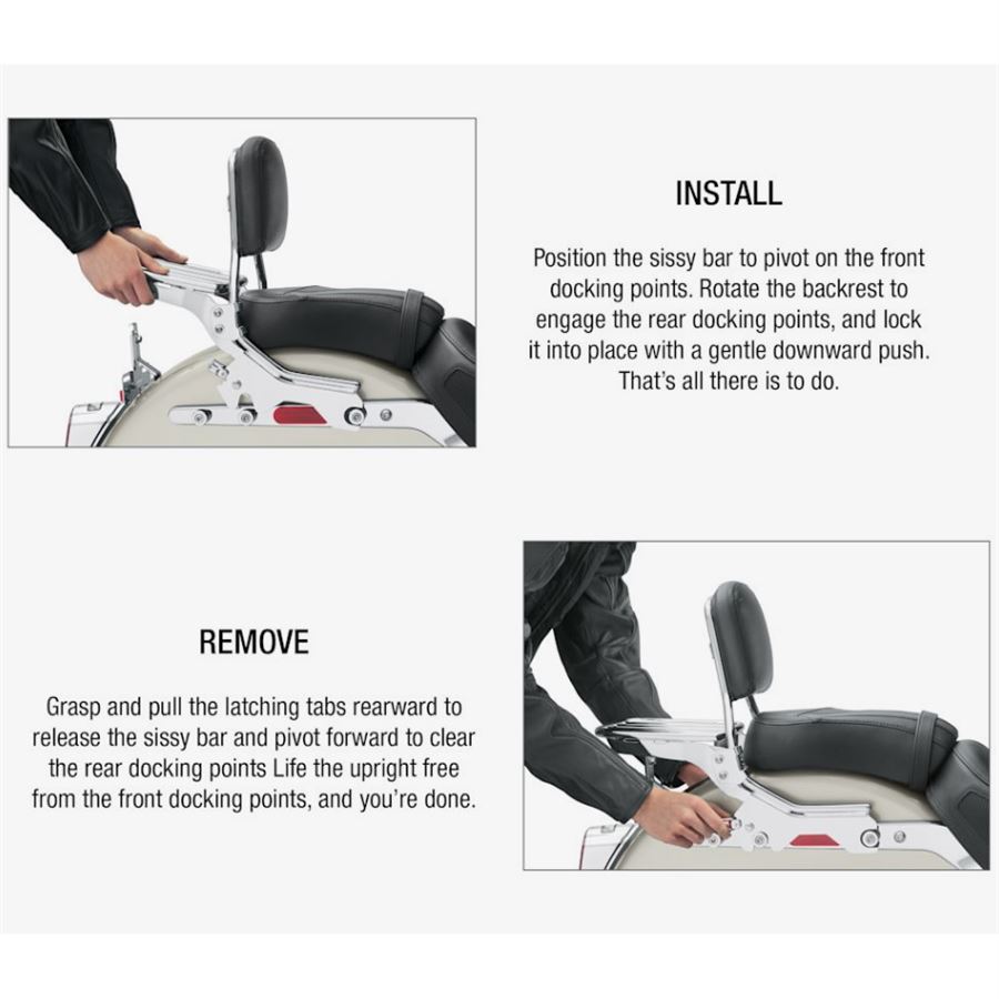 - Jednou nainstaluješ, a pak už jen přehazuješ sissy bar, nosič nebo Tour-Pak podle typu jízdy.