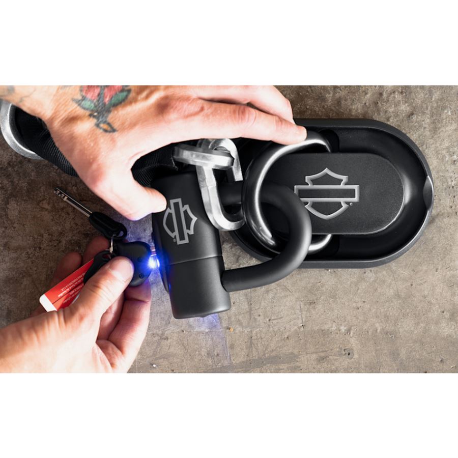 Řetěz s okem (cinch ring) usnadňuje dotažení k pevnému bodu a zámek s vinylovým potahem chrání lak a povrch komponent před odřením. Vysokobezpečnostní vložka, anti-float disky, nylonový kryt proti prachu a osvětlený klíč pro noční používání dělají z téhle sady promyšlené a praktické řešení. Perfektně funguje v kombinaci se Security Anchor (P/N 92800013).