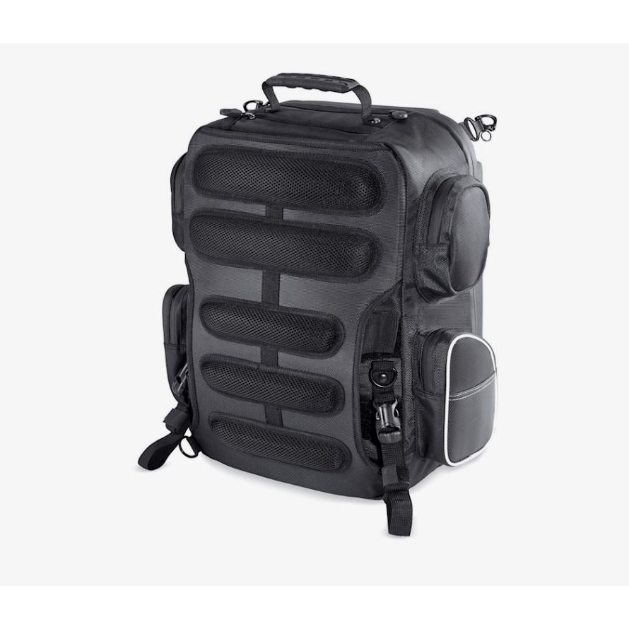 Zvenku má dvě přední kapsy (jednu s fleecovou podšívkou na brýle), „draw-bridge“ organizér na doklady a pera a čtyři boční kapsy na nabíječky, klíče a drobnosti. Integrované upínací popruhy na motorku se dají schovat do vlastní kapsy, takže když sesedneš, batoh vypadá čistě. Skryté batohové popruhy a zvýšené polstrované záda zajistí pohodlí při nošení mimo motorku.