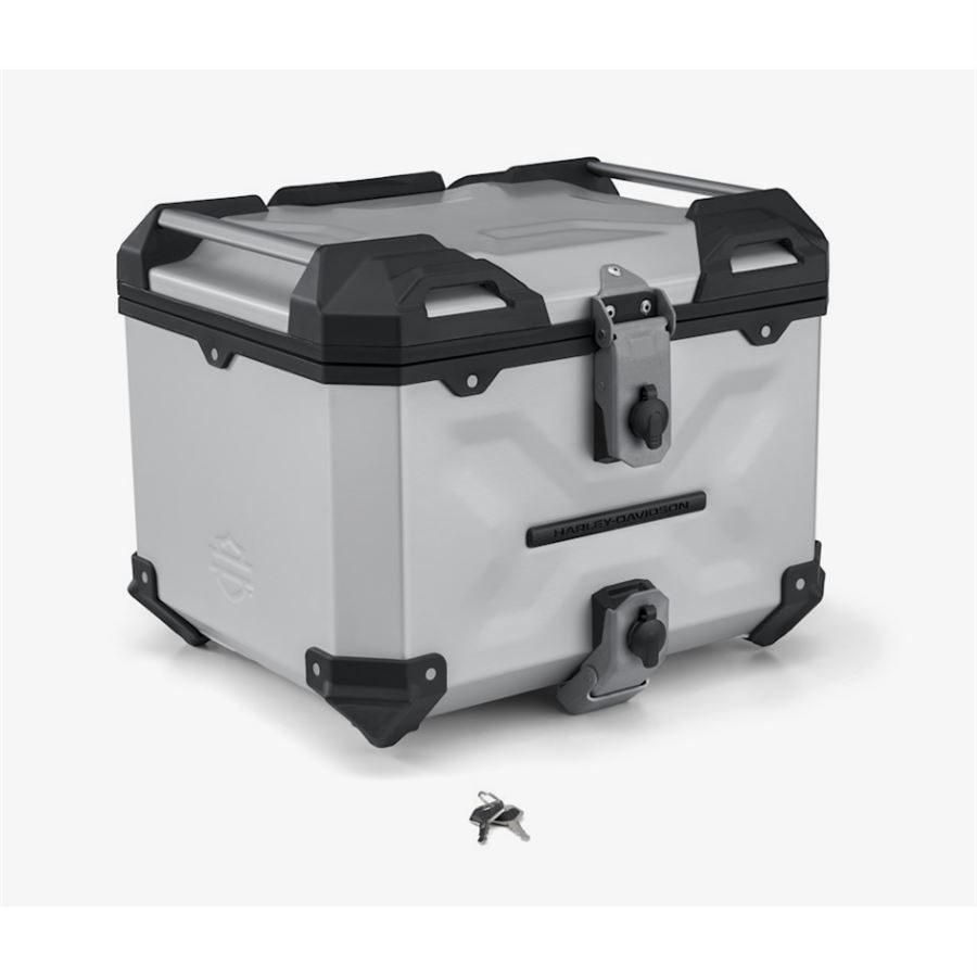 Čirý eloxovaný povrch je odolný proti oxidaci a snadno se čistí. Díky těsnění ve víku je kufr plně vodotěsný a splňuje přísné testy průniku vody Harley-Davidson®. Integrovaná madla a oka pro uchycení bungee popruhů zvyšují praktičnost a umožňují snadnou manipulaci. Jediným klíčem uzamknete víko kufru i samotný kufr k montážní desce.