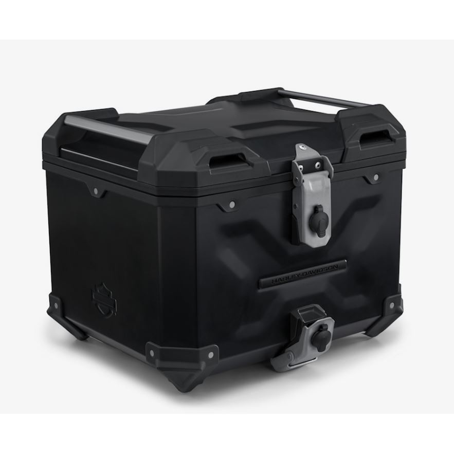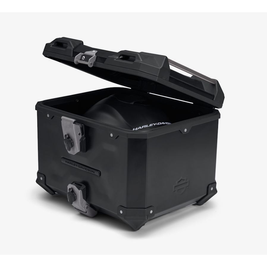 Černě lakovaný povrch je odolný, snadno se čistí a chrání hliník před oxidací. Díky těsnění ve víku je kufr plně vodotěsný a splňuje přísné testy průniku vody Harley-Davidson®. Integrovaná madla a oka pro uchycení bungee popruhů zvyšují praktičnost na cestách, a jedním klíčem uzamkneš víko kufru i samotný kufr k montážní desce.