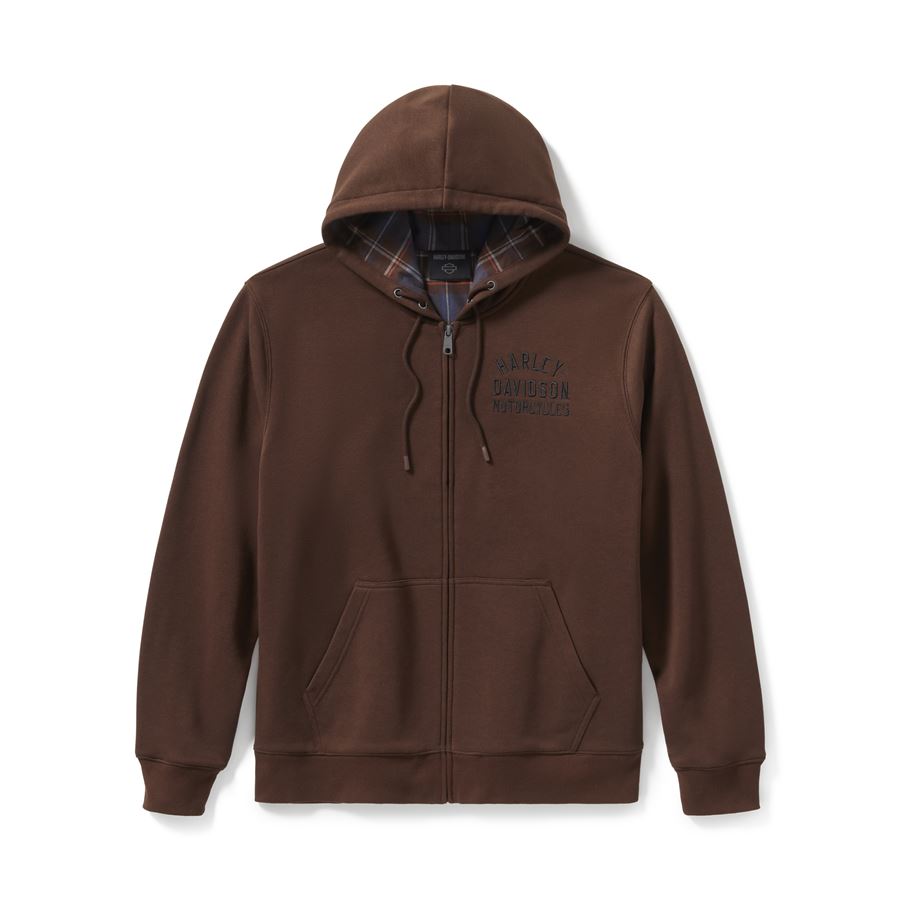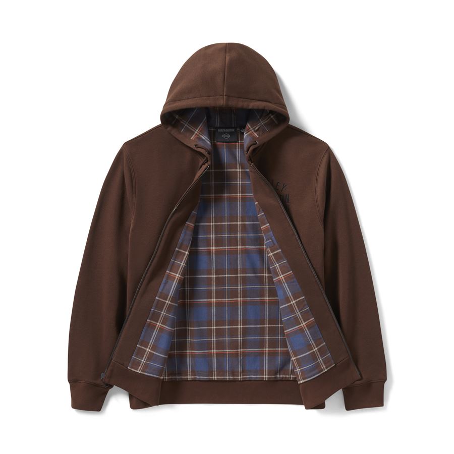 Středně silný bavlněno-polyesterový fleece je měkký a pohodlný, zatímco kontrastní kostkovaná podšívka kapuce dodává originální vzhled.