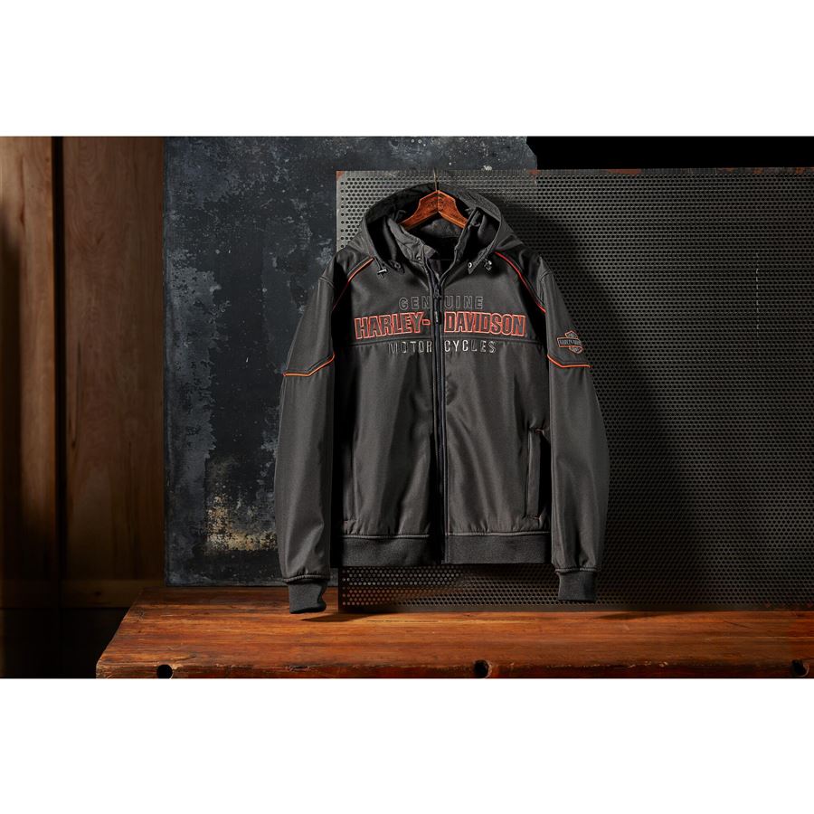 Černé provedení je oživené kontrastními oranžovými detaily a výraznou výšivkou Harley-Davidson® na hrudi i zádech. Díky odepínatelné kapuci je bunda univerzální a snadno se přizpůsobí různým podmínkám.