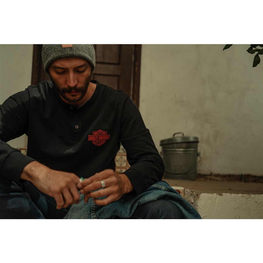 Styl Henley s tříknoflíkovým zapínáním a žebrovanými manžetami odkazuje na tradiční závodní dresy H-D® a přináší kombinaci pohodlí a autentického stylu.