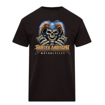 Přední strana: motiv lebky v šaškovské čepici a nápis Harley-Davidson Motorcycles