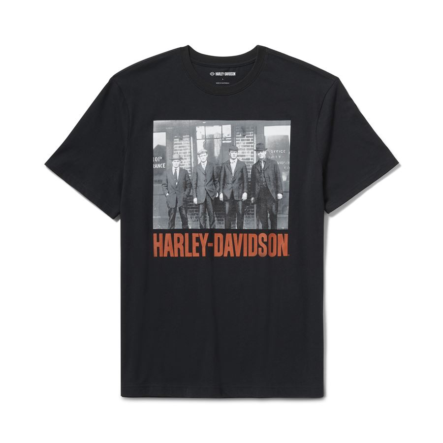 Černé bavlněné tričko s archivní fotografií z roku 1912 oslavuje samotné kořeny značky Harley-Davidson.