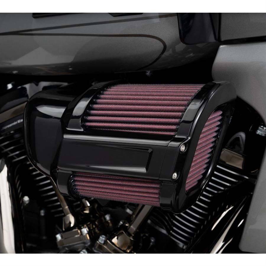 Screamin' Eagle® Heavy Breather Extreme Air Cleaner je sání navržené na maximální výkon – závodně inspirovaná konstrukce přivede do Milwaukee-Eight® motoru až o 20 % víc vzduchu než sériový air box. Ve vyšších rychlostech (cca nad 60 mph) funguje efekt „ram-air“: vzduch je zachytáván čelní plochou filtru, tlačen do závodně tvarovaného kolena a odtud přímo do škrticí klapky – minimální odpor, maximální průtok.