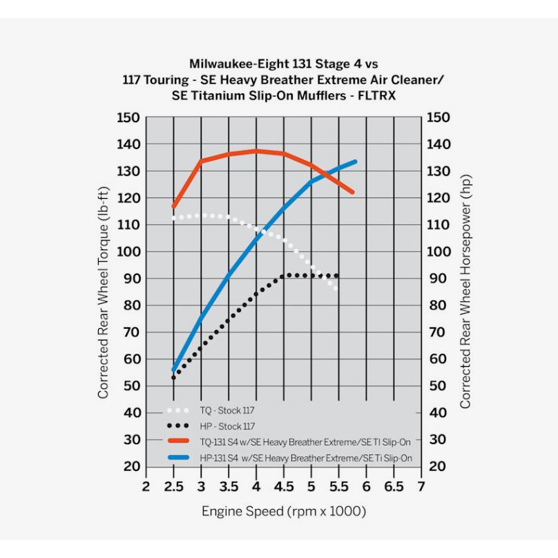 Screamin’ Eagle Stage IV Kit 117 → 131 CI je určen pro jezdce, kteří požadují naprosto nekompromisní výkon. Tento kit, vyvinutý přímo odborníky Harley-Davidson, přináší extrémní zátah v celém spektru otáček a dosahuje až 131 koní a 139 ft-lb točivého momentu na zadním kole.