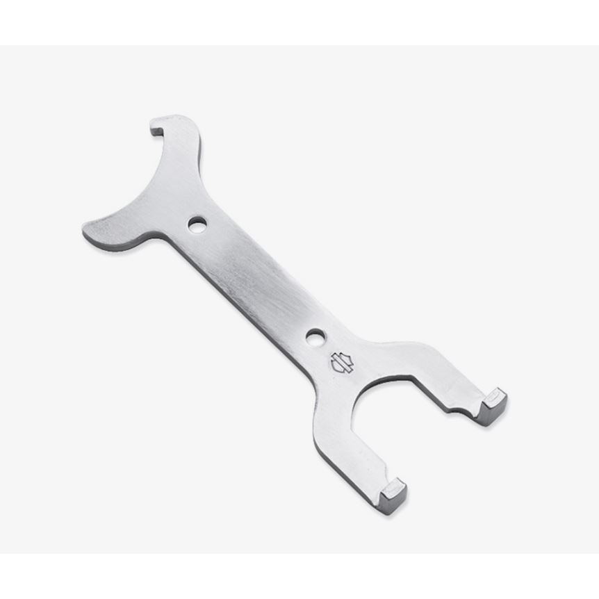 Shock Adjustment Spanner Harley-Davidson je praktický univerzální klíč určený pro nastavení předpětí pružiny u mechanicky stavitelných zadních tlumičů H-D®. Díky kompaktním rozměrům se snadno vejde do originální sady nářadí Harley-Davidson a je ideálním pomocníkem na cesty i do dílny.