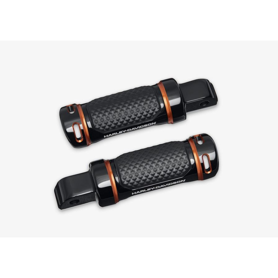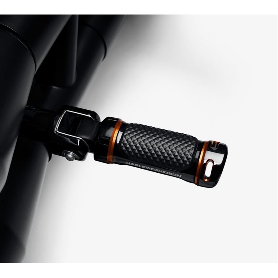 Adversary™ Passenger Footpegs z prémiové kolekce – precizní, technický design kovaného billet hliníku s odolným dual‑anodizovaným černým povrchem a oranžovými akcenty. Přidávají agresivní, výkonově laděný vzhled a zároveň poskytují pevný, pohodlný opěrný bod pro spolujezdce.