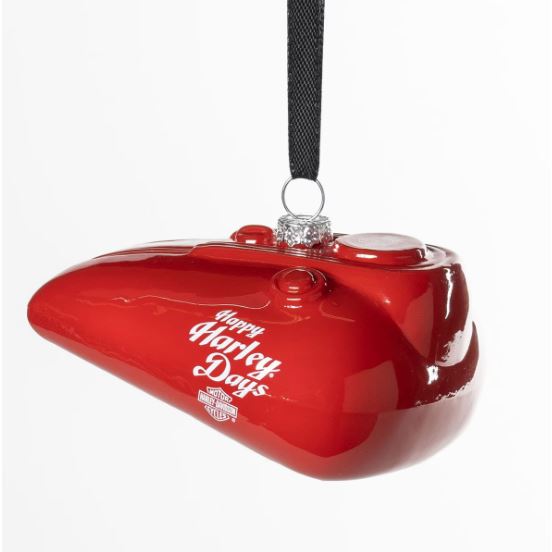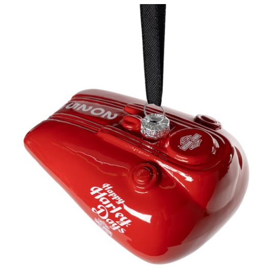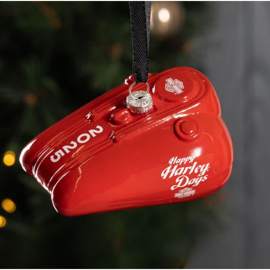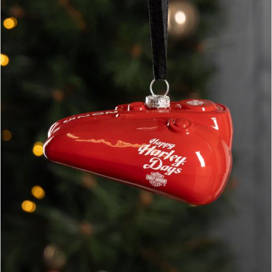 Stylová vánoční dekorace Harley-Davidson® ve tvaru červené skleněné nádrže dodá vašemu stromečku originální motorkářský nádech.
