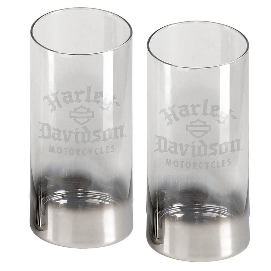 Stylová sada highball sklenic Harley-Davidson® Silver Ombre zaujme moderním metalickým ombré efektem a ikonickým Old English logem Harley-Davidson®.